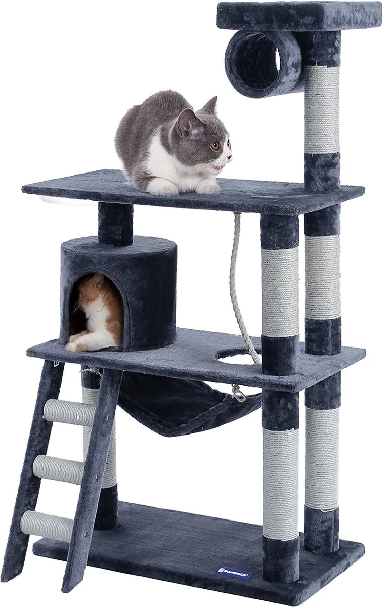 - Klassiek design: met 1 hol, 1 krabton, 1 hangmat, 2 ligplaten, 1 trap en 1 speeltouw biedt de krabpaal veel mogelijkheden om te knuffelen, te verbergen en te spelen, en ook diverse spring- en klimmogelijkheden