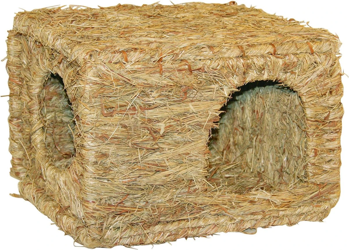 Veilig, royaal en eetbaar speelhuis van gras. Voor bijvoorbeeld cavia’s of chinchilla’s. • natuurlijk gedroogd gras • geschikt voor consumptie • bevat geen gevaarlijke draad- of kunststofdeeltjes • Levering ingeklapte onderdelen in kartonnen doos