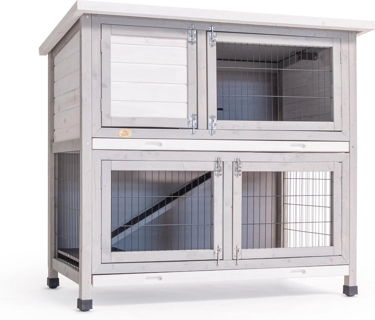 Konijnenhok KP5-A is een mooi groot konijnenhok met dubbele uitschuifbare lade. De benedenverdieping van dit hok is gesloten en hierdoor kan het hok dus veilig op zachtere ondergrond geplaatst worden. Excl. anti-knaagstrips.