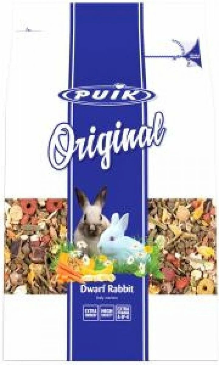 Puik Original Dwergkonijn is een krokante dagelijkse voeding voor dwergkonijnen. Met 22 ingrediënten een zeer gevarieerde voeding. Met extra vitamine A, D3 en E en wortel, banaan en pompoenpitten als extraatje. Een (h)eerlijk product van Puik.