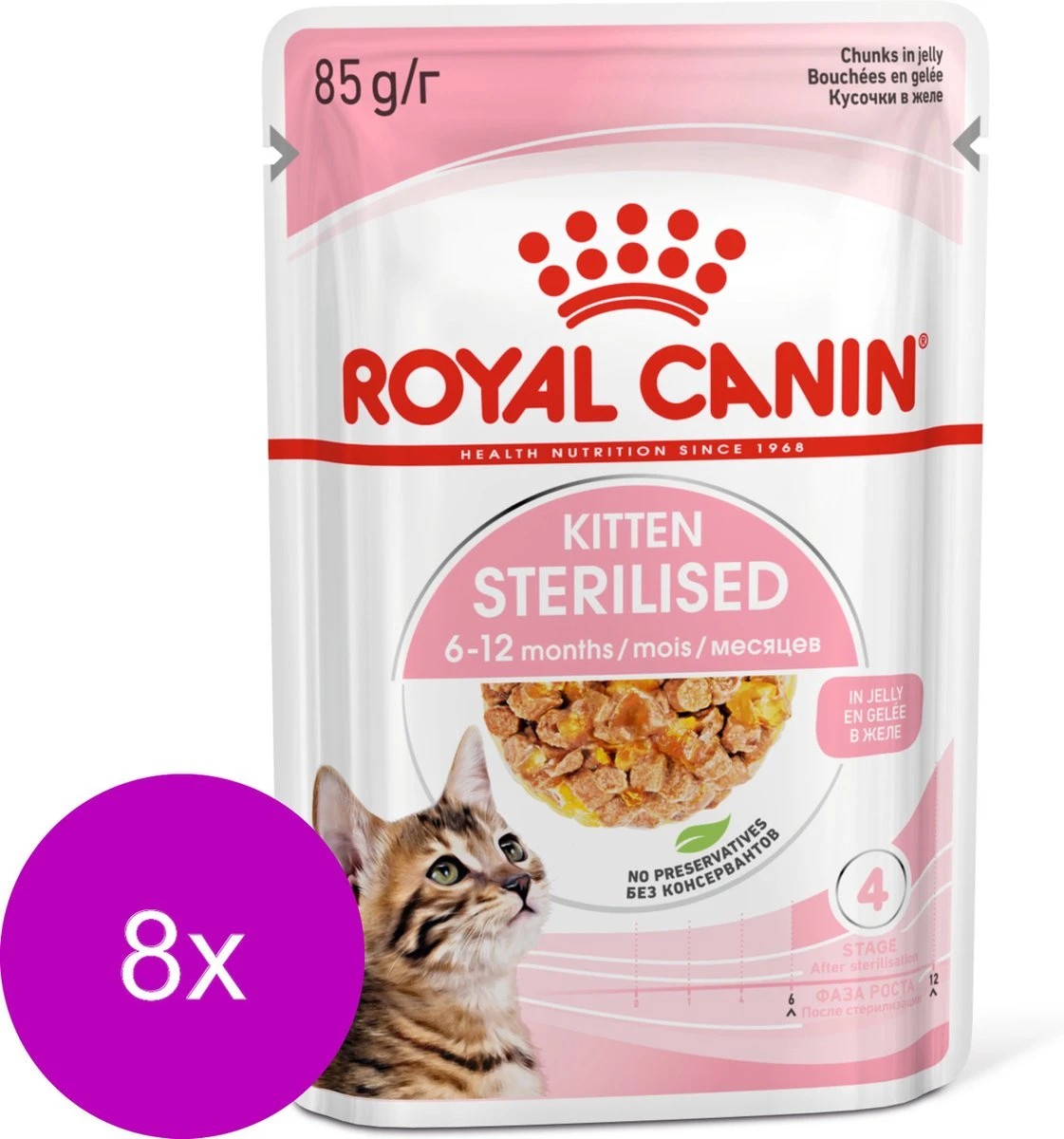 Zachte textuur voor melktandenOptimale grootte van de brokjes, textuur en smaak voor opgroeiende kittens Sterk immuunsysteemVoedingsstoffen zoals vitamine C en E om de ontwikkeling van het immuunsysteem te ondersteunen Groei en gewichtscontroleAangepast vetgehalte om gewichtstoename te helpen beperken Ondersteunt de darmfloraPrebiotica en hoogverteerbare eiwitten om een gezond evenwicht in de darmflora te ondersteunen. Veel eigenaren steriliseren hun kittens vanaf de leeftijd van ongeveer 6 maanden. Binnen 48 uur na de operatie vertraagt de stofwisseling, maar het hongergevoel van je kitten neemt net toe. Omdat gesteriliseerde kittens nog steeds aan het groeien zijn, hebben ze voeding nodig die een gezonde groei ondersteunt, echter zonder onnodige gewichtstoename te stimuleren. ROYAL CANIN® Sterilised Kitten Jelly (in gelei) is speciaal samengesteld om de voedingsbehoeften van gesteriliseerde kittens tijdens hun groei te ondersteunen. Deze formule is geschikt voor gesteriliseerde kittens van 6 tot 12 maanden oud, een levensfase die gepaard gaat met aanzienlijke fysieke en gedragsveranderingen. Deze voeding op maat bevat brokjes in gelei met een optimale grootte, textuur en smaak voor opgroeiende kittens. Dit product bevat een matig vetgehalte om het risico op gewichtstoename te helpen beperken, terwijl het optimale hoeveelheden eiwitten, calcium en fosfor bevat voor een gezonde ontwikkeling. Daarnaast ondersteunen voedingsstoffen zoals vitamine C en E de ontwikkeling van een gezond immuunsysteem. Er is aangetoond is dat deze antioxidanten een grotere hoeveelheid en snellere toename van antilichamen na vaccinatie stimuleren. Dankzij een combinatie van prebiotica (MOS) en hoogverteerbare eiwitten helpt ROYAL CANIN® Sterilised Kitten Jelly ook een gezond evenwicht in de darmflora te ondersteunen voor een goede spijsvertering. ROYAL CANIN® Sterilised Kitten Jelly is ontwikkeld om zelfs bij de meest veeleisende kittens in de smaak te vallen. Deze natvoeding biedt een positieve zintuiglijke ervaring, ondersteunt een gezonde hydratatie en kan perfect gecombineerd worden met droogvoeding van ROYAL CANIN® Kitten. Wist je dat de voedingsbehoeften van kittens veranderen naarmate ze groeien? Op de leeftijd van 12 maanden hebben ze voeding nodig die specifiek aangepast is aan hun voedingsbehoeften als gesteriliseerde volwassen kat. Daarom raden wij aan om dan over te stappen op producten voor gesteriliseerde volwassen katten van ROYAL CANIN®. Bij Royal Canin zetten we ons in voor een betere wereld voor katten en honden. Al meer dan 50 jaar werken we nauw samen met fokkers, dierenartsen en andere deskundigen op het gebied van huisdieren, waarbij we kennis en resultaten van wetenschappelijk onderzoek delen om tot een toegewijde benadering te komen met nauwkeurig geformuleerde op maat gemaakte voeding. Al onze producten worden onderworpen aan uitgebreide kwaliteitscontroles om een optimale kwaliteit te garanderen. Wij gebruiken voedingsstoffen zonder toegevoegde kunstmatige conserveermiddelen of kleurstoffen. Kies voor ROYAL CANIN® Sterilised Kitten Jelly om voor een complete en uitgebalanceerde voeding te zorgen voor jouw kitten.