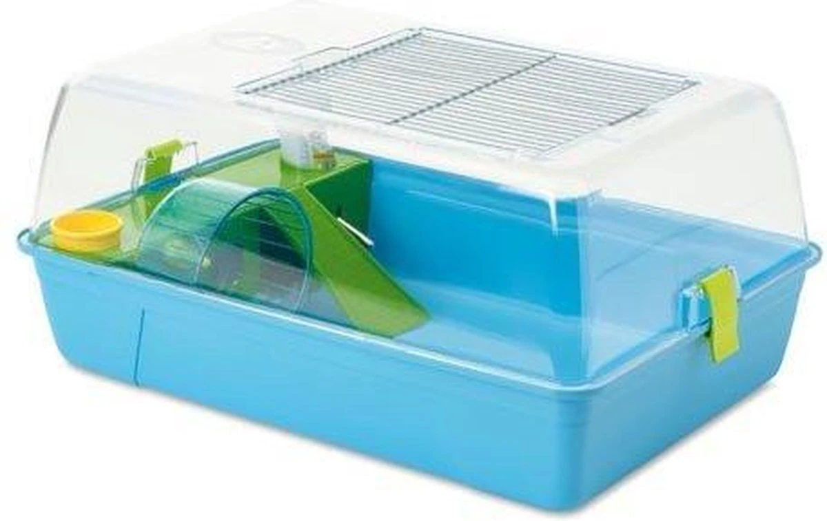 Mooie, moderne Rody Hamster kooi, zeer onderhoudsvriendelijk door de kunststof bovenkant; houdt de rommel in de kooi. Aan de bovenzijde wit maaswerk. Afmetingen : 55 x 39 x 26 cm