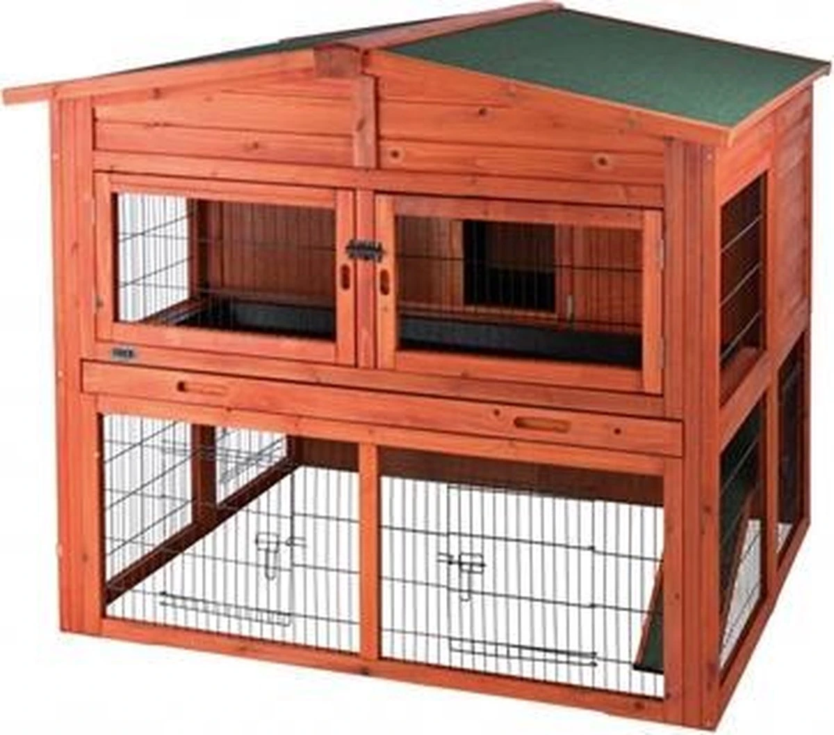 Trixie Natura Konijnenhok XL met Ren 135x115x112 cm• Twee verdiepingen • Van gebeitst vurenhout • Stevig metalen traliewerk, gepoedercoat • Met bitumen dak • Schuilmogelijkheid met schuifdeur • Door kunststof schuiflades makkelijk en snel schoon te maken • De ene helft van het dak heeft opbergruimte en uitneembare bodemplaten • Dakhelften van bovenaf te openen • 7 deuren, waardoor je overal makkelijk bij kunt, ook om schoon te maken • De houten achterwand in de ren dient als windscherm • Afsluitbaar bodemluik met kunststof coating • Door de geringe afstand tussen de spijlen (2 cm) in het traliewerk is het ook geschikt voor de opfok van jonge dieren • Ook geschikt voor kleine leefgroepen • Ren met 4 traliedeuren, waardoor flexibel samen met andere natura rennen te gebruiken