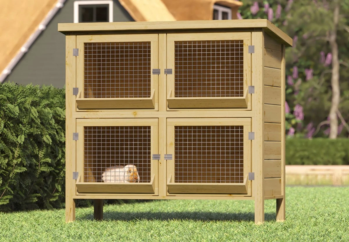 Konijnenhok of caviahok voor buiten ‘Rijnlander’ is gerealiseerd uit geimpregneerd vuren hout met een onder en bovenverdieping. Het hok is geschikt om 4 cavia’s / kippen / konijnen apart van elkaar te huisvesten. Elk hok heeft een apart deurtje zodat u eenvoudig bij de dieren kunt komen en het hok kan verschonen!