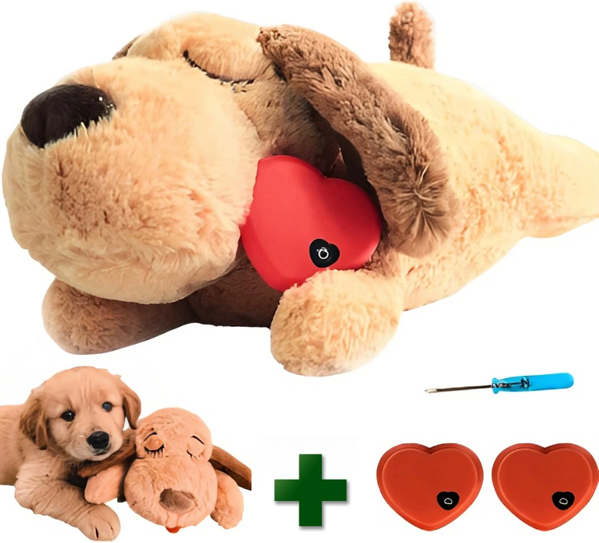 Je ontvangt bij bestelling een kloppend hartje werkend met twee AAA-batterijen en nog een reserve hartje. Dit hartje heeft een levensechte hartslag waardoor je hond intimiteit ervaart en tot rust zal komen. Het hartje is zo levensecht dat je het zelfs kan horen kloppen. Dankzij de woefie hondenknuffel voelt hij zich minder snel alleen wanneer je weg bent.